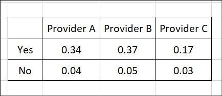 Moreover, the two events having a contract with provider B and not having cell phone service are independent events since P(provider B) is equal to the P(provider B | No)