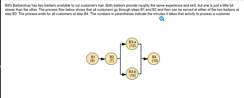 l, but one is just a little bit slower than the other. The process flow below shows that all customers go through steps B1 and B2 and then can be served at either of the two barbers at step B3. The process ends for all customers at step B4. The numbers in parentheses indicate the minutes it takes that activity to process a customer.