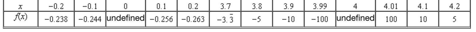 There is a vertical asymptote when x = 4 because at near points to x = 4 function values are very different between  themselves.