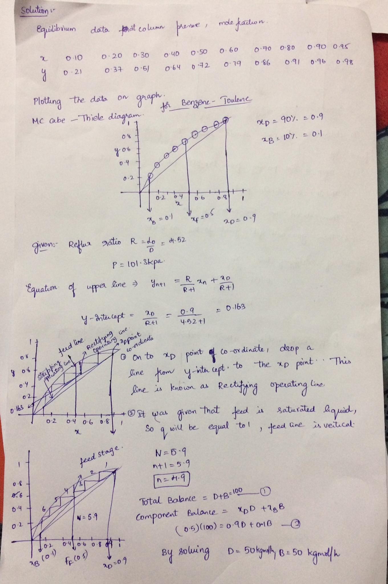 feed is liquid at the boiling point. The distillate is to contain 90 mol % benzene and the bottoms 10 mol % benzene. The reflux ratio is 4.52:1. Calculate the kg mol/h distillate, kg mol/h bottoms, and the number of theoretical trays needed using the McCabe–Thiele method.