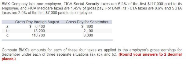 TKSC Company has one employee, Reba Shas. FICA Social Security taxes are 6.2% of the first $117,000 paid to its employee, and FI CA Medicare taxes are 1.45% of gross pay. For TKSC, its FUTA taxes are .6% and SUTA taxes are 2.9% of the first $7,000 paid to its employee.