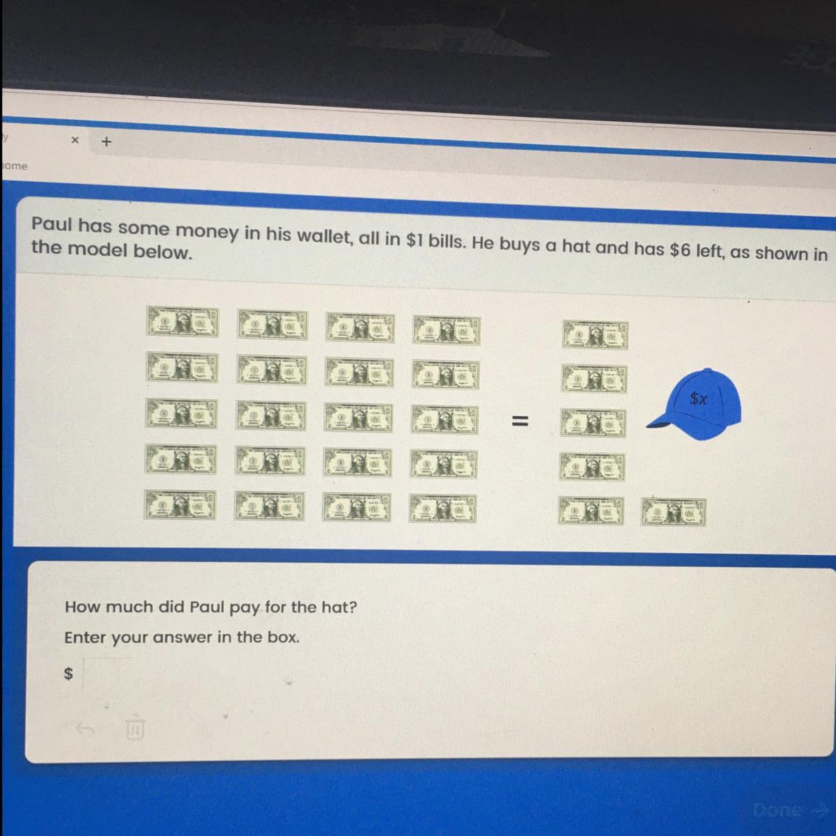 Paul has some money in his wallet, all in $1 bills. He buys a hat and has $6 left, as shown in