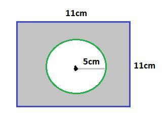 =(LXW)-\pi r^2\\=(11X11)-(\pi X 5^2)\\=42.46cm^2 $(correct to the nearest huundredth)