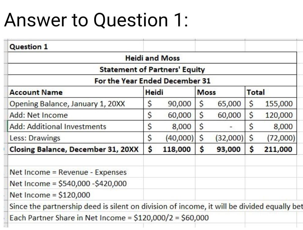 rrent fiscal year. On April 10, Heidi invested an additional $8,000. During the year, Heidi and Moss withdrew $40,000 and $32,000, respectively. Revenues were $540,000 and expenses were $420,000 for the year. The articles of partnership make no reference to the division of net income. Required: 1. Prepare a statement of partners' equity for the partnership of Heidi and Moss. If an amount box does not require an entry, leave it blank. Enter all amounts as positive numbers. Heidi and Moss Statement of Partners' Equity For the Year Ended December 31 Heidi Moss Total Capital, January 1 $ 90,000 $ 65,000 $ 155,000 Net income for the year 60,000 60,000 120,000 $ $ $ $ $ $ Withdrawals during the year Capital, December 31 $ 118,000 $ 93,000 $ 211,000 2. Journalize the entries to: Close the revenue and expenses account. Close the drawing accounts. If an amount box does not require an entry, leave it blank. a. Revenues 540,000 Heidi, Capital 540,000 Moss, Capital 420,000 Heidi, Capital 40,000 Moss, Capital Moss, Drawing b. Heidi, Capital 40,000 Moss, Capital 32,000 Heidi, Drawing 40,000 Moss, Drawing 32,000