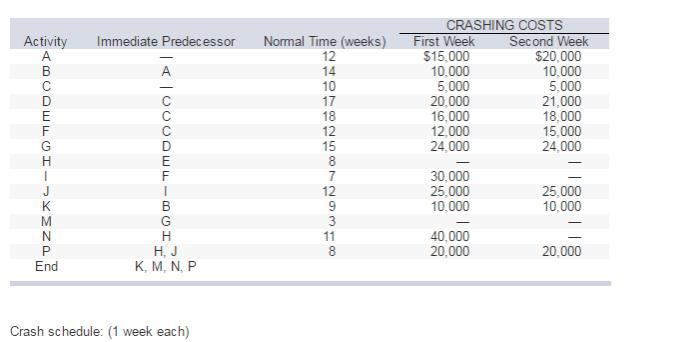 At week 5 : The crash activity P will be at $20000 and crash activity E will be at $16000 hence the completion time will be 44 weeks