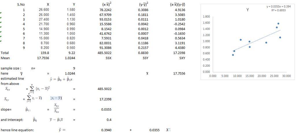 d) for x=20 ; predicted temperature =0.3940+0.0355*20=1.1041