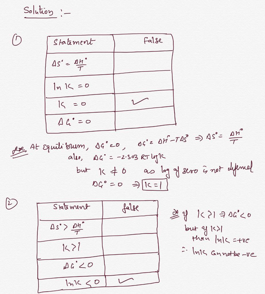 e AG Gibbs free energy of reaction and stands for the equilibrium constant. stands for the standard In each table, there may be one statement that is false because it contradicts the other three statements. If you find a false statement, check the box next to It. Otherwise, check the "no false statements box under the table. statement false? statement false? Ink>0