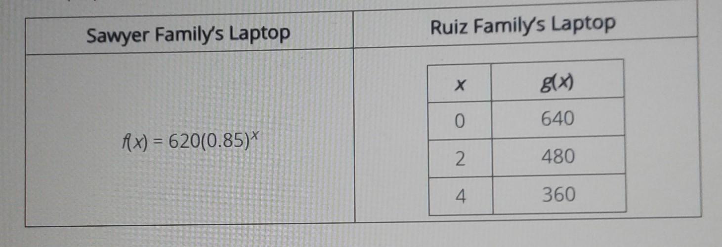 The Sawyer and Ruiz families each bought a laptop computer at the same time resale values in dollars of the laptops are modeled