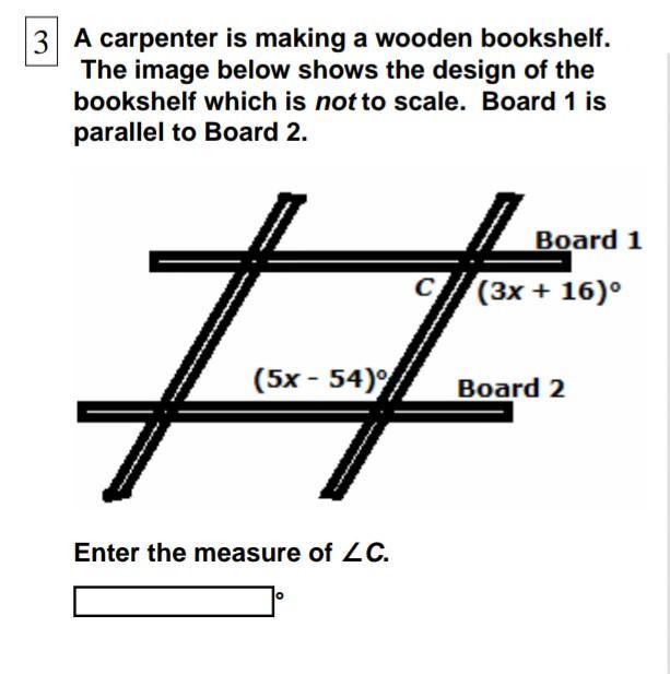 From the diagram, we can see that Angle (3x + 16)° and Angle (5x - 54)° are alternate interior angles.