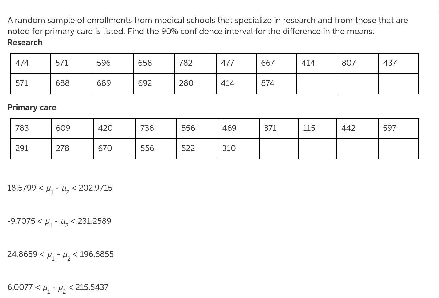 the exercise invites us to find the differences between the measures of a random sample of enrollments in medical schools where some specialize in research and others in primary care, with this we know that the variations in the population are different