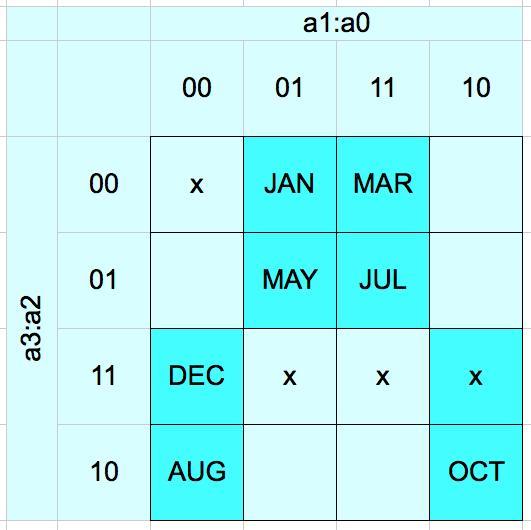 ple, if the inputs are 0001, the month is January, and if the inputs are 1100, the month is December. The circuit output, Y, should be HIGH only when the month specified by the inputs has 31 days in it. However, if the input is not a valid month (such as 0 or 13) then the output is don’t care (can be either 0 or 1).