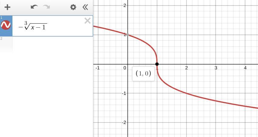 Translation "h" units to the right is accomplished by replacing x with (x-h) in a function definition. Reflection across the x-axis is accomplished by negating the output of the function. That is, ∛x has been transformed to -∛(x-1).
