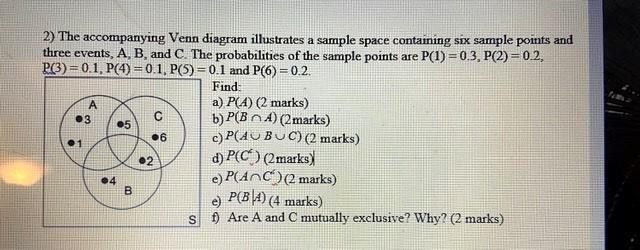 The accompanying Venn diagram illustrates a sample space containing six sample points and three events, A, B, and C. The probabi