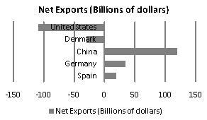 The bar graph in the following graphic represents fictional net exports in billions of dollars for five countries. Net exports a