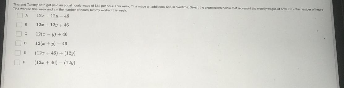 expression D is gotten by factoring out 12; 12x + 12y + 46 = 12(x + y) + 46