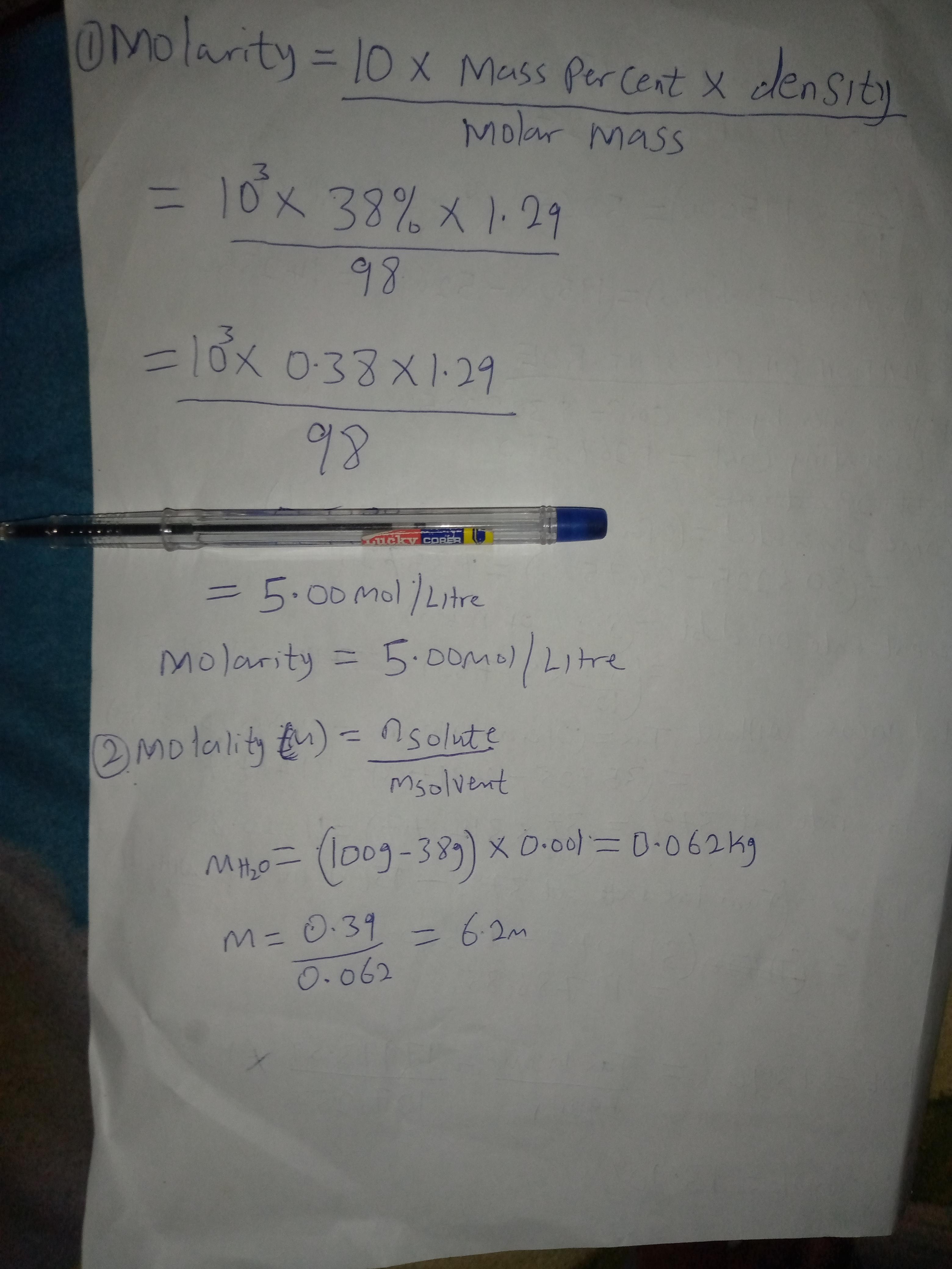On the other hand, the molality is defined as the ratio of the moles of the solute to the mass of the solvent in kilograms, thus, we compute the mass of water (solvent) as shown below: