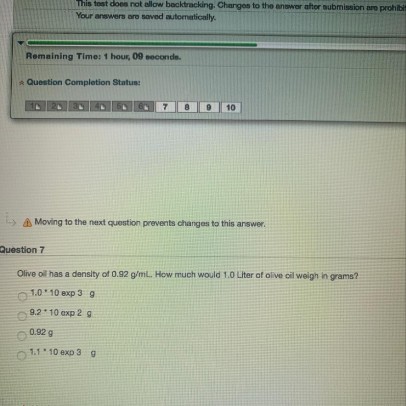 Olive oil has a density of 0.92g/ml. How much would 1.0 Liter of olive oil weigh in grams?