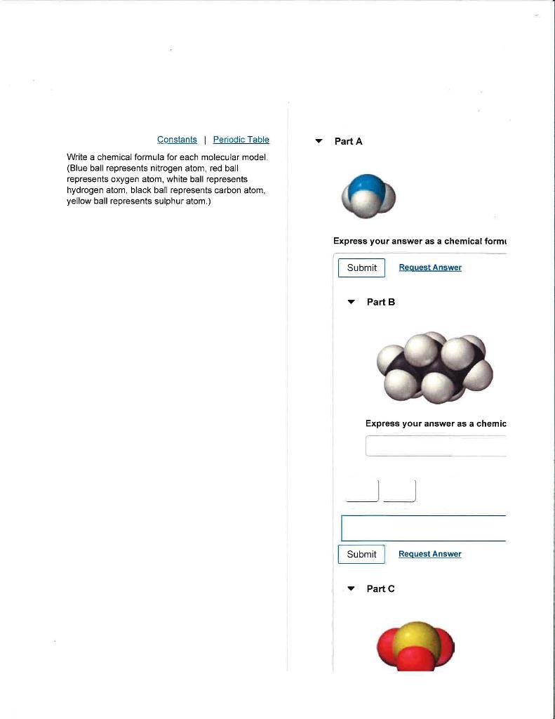 According to the picture below, you need to write a chemical formula for each molecular model.