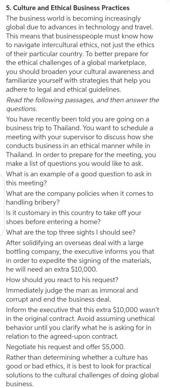 <em>This is a good question to ask because it aims to find out how the company deals with a very important ethical issue which is that of bribery. Your supervisor needs to tell you how the company normally deals with bribery so that you can act appropriately and abide by the ethics of the company. </em>