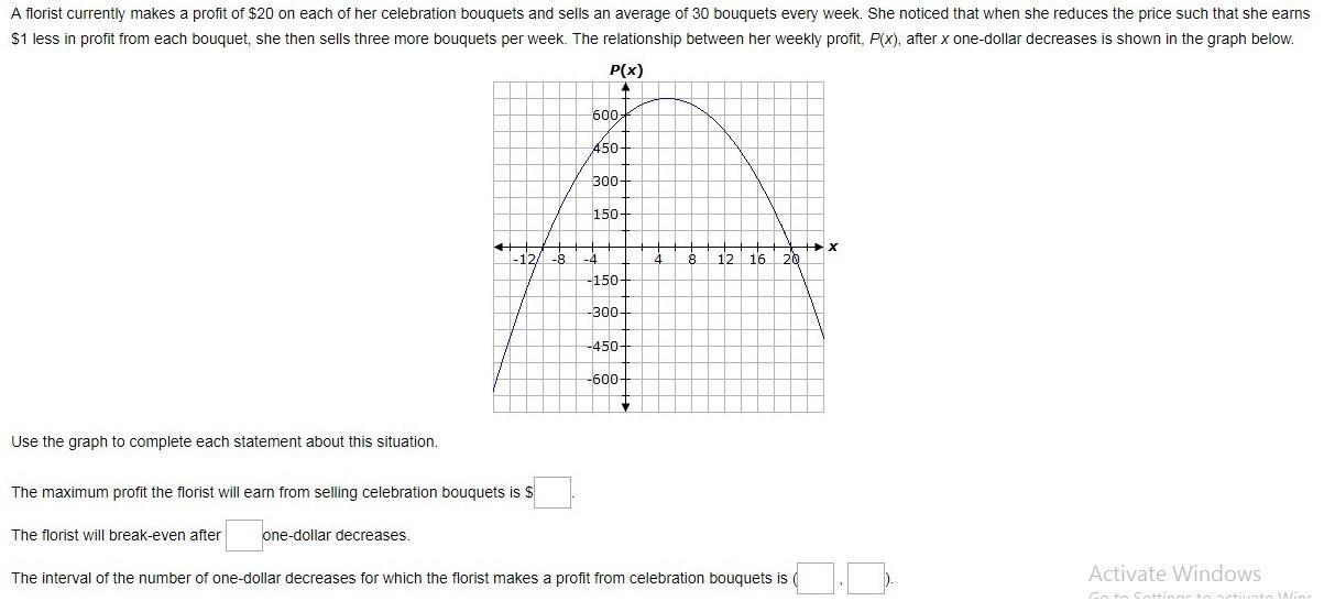 The interval of number of one dollar decreases can be observed at the point where we have the value of P(x) been more than zero, looking at the given graph, the P(x) has its value greater than zero at the interval 0 to 20.Therefore, it can be concluded that the interval of number of one dollar decreases for which the florist makes a profit from celebration bouquet is (0, 20)