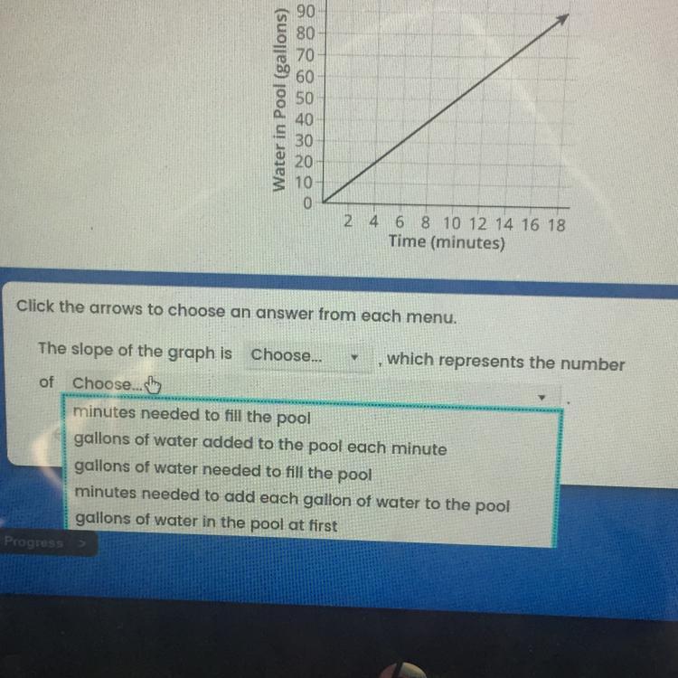 The X-axis is the time and the Y-axis is the gallons. Y is the one being influenced by X. So, the amount of gallons in the pool is being influenced by the amount of time.
