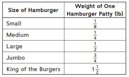 Please refer to the attached table where we are given size of hamburgers and the weight of corresponding hamburger patty in pounds.
