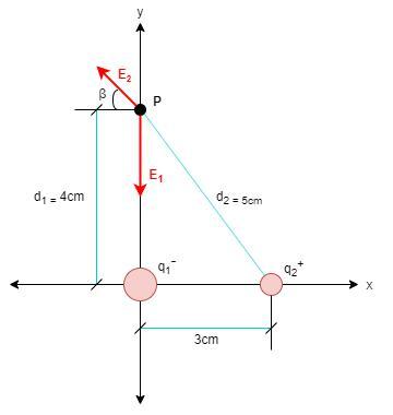 E₂: Electric Field at point  P(0,4) cm  due to charge q₂. As the charge q₂ is positive (q₂+) ,the field leaves the charge