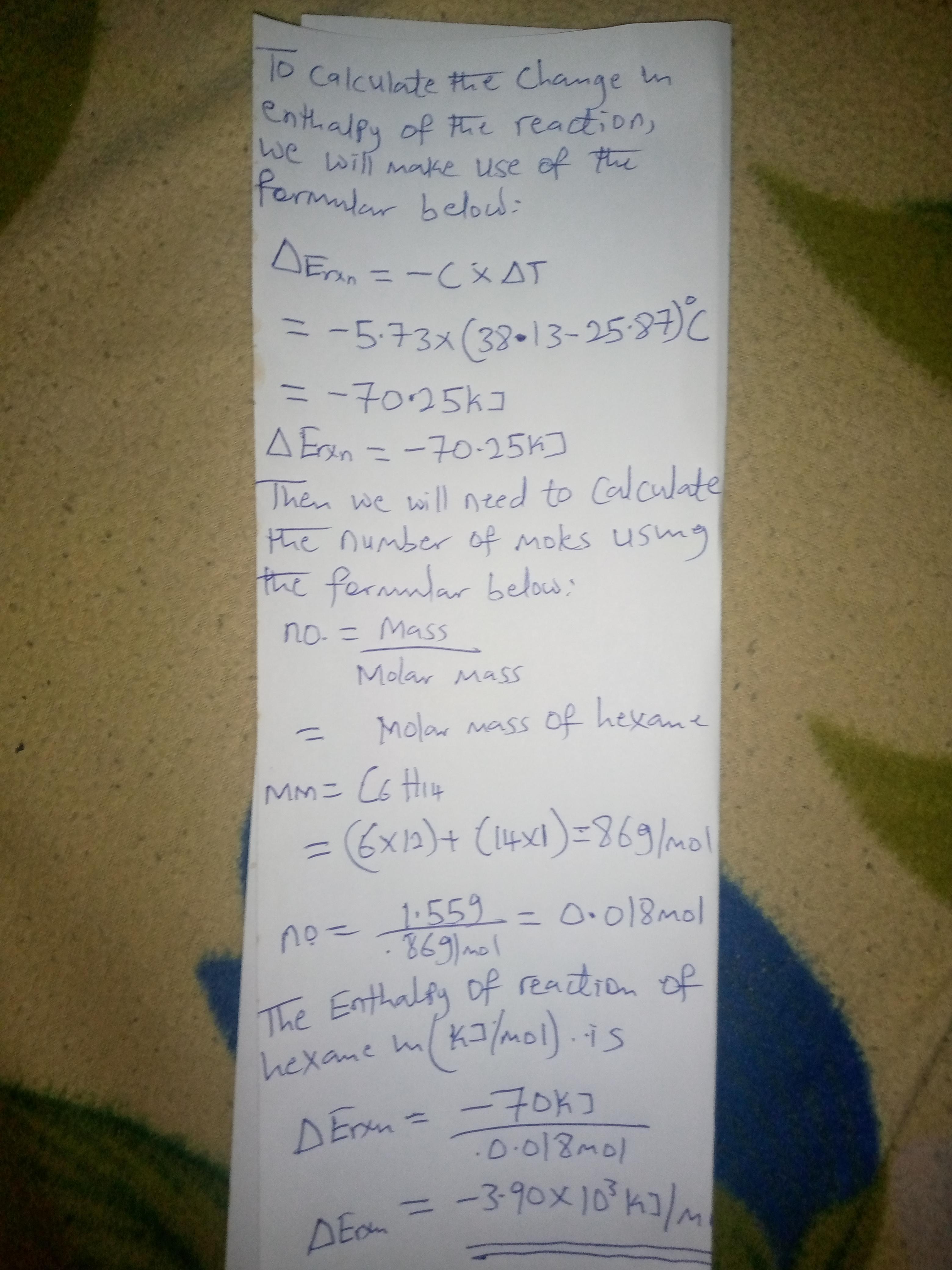 to 38.13 ∘C∘C. Find ΔErxnΔErxn for the reaction in kJ/molkJ/mol hexane. The heat capacity of the bomb calorimeter, determined in a separate experiment, is 5.73 kJ/∘CkJ/∘C.
