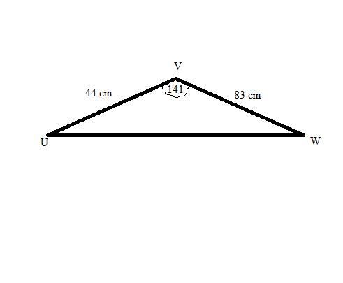 In ΔUVW, w = 44 cm, u = 83 cm and ∠V=141°. Find the area of ΔUVW, to the nearest square centimeter.