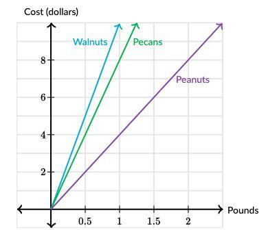 In this screenshot, peanuts (purple line) is farthest on the pounds lines (x access lines). The "title" for the x access line is pounds. That represents the quantity of the nuts. So, which line is farthest on the pounds line (which nut can you get the biggest quantity for while paying the least amount for it)? The answer would be the peanut line. It says in the graph that you can pay $1 for 0.5 pounds, whereas with the walnuts and pecans, you get a smaller amount. So, the final answer would be peanuts.
