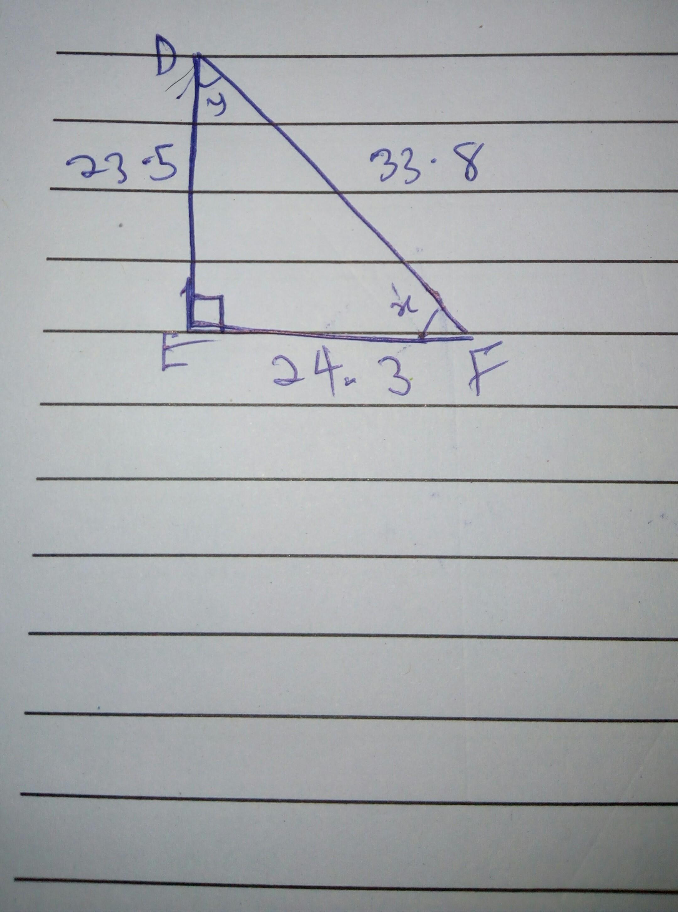 Triangle D E F is shown. Angle D E F is a right angle. The length of hypotenuse D F is 33.8, the length of D E is 23.5, and the