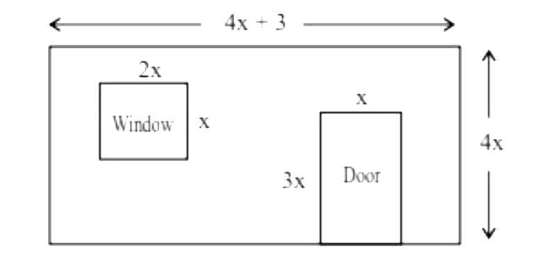 From the image attached, it is given that the dimension of the rectangular wall to be painted is (4x+3) by (4x), the dimensions of the window is (2x) by (x) and the dimensions of the door is (x) by (3x).