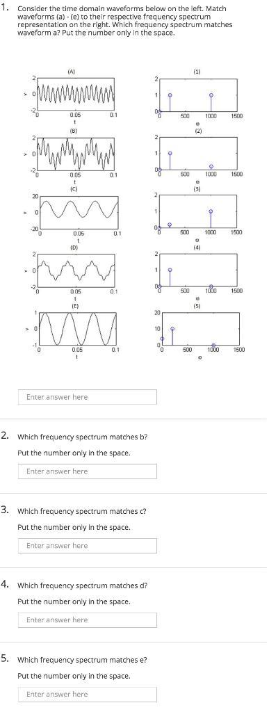Consider the time domain waveforms below on the left. Match waveforms (a) - (e) to their respective frequency spectrum represent