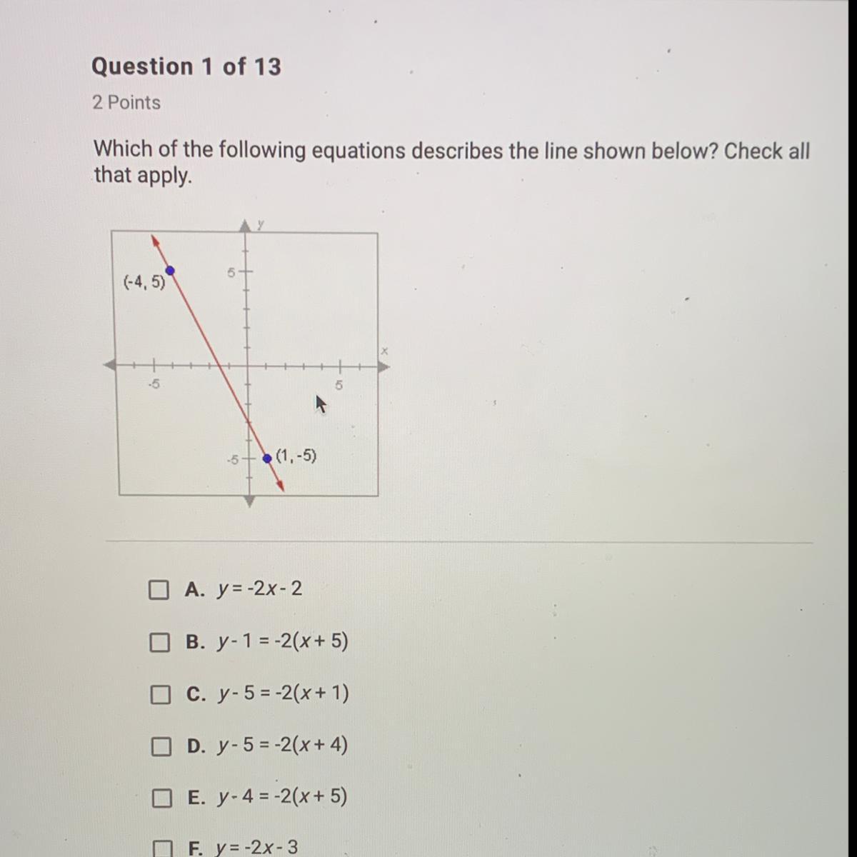 Point slope: y-5=-2(x+4) or y+5=-2(x-1)
