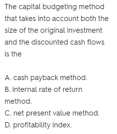 The capital budgeting method that takes into account both the size of the original investment and the discounted cash flows is t