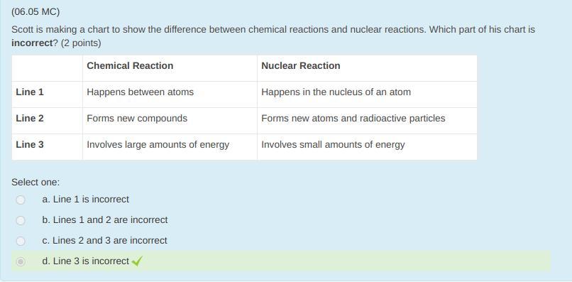 rrect? Line 1: Chemical Reaction - Happens in the nucleus of atoms. Nuclear Reaction - Happens between atoms. Line 2: Chemical Reaction - Forms new compounds. Nuclear Reaction - Forms new atoms and radioactive particles. Line 3: Chemical Reaction - Involves small amounts of energy. Nuclear Reaction - Involves large amounts of energy. Answer choices: A) Line 1 is incorrect B) Lines 1 & 2 are incorrect C) Lines 2 & 3 are incorrect D) Line 3 is incorrect