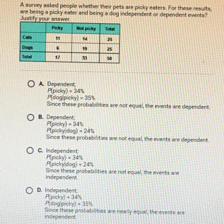 In the question above, as mentioned in the image or attachment, the probability of dog being picky or non-picky eater can be both dependent and independent in the different scenarios.