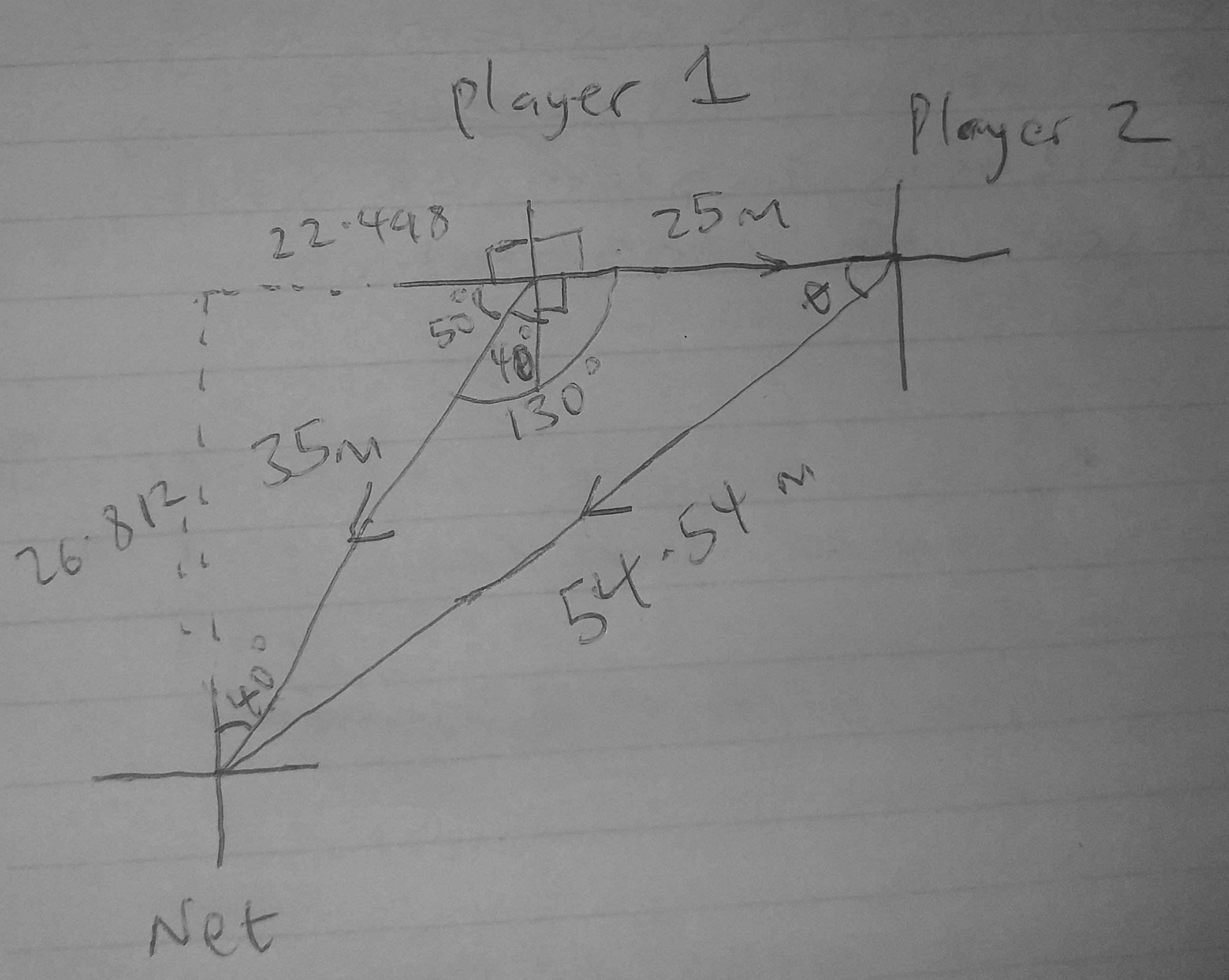The displacement of the net from player 2 = (-22.498î - 26.812j) - (25î) = (-47.498î - 26.812j)