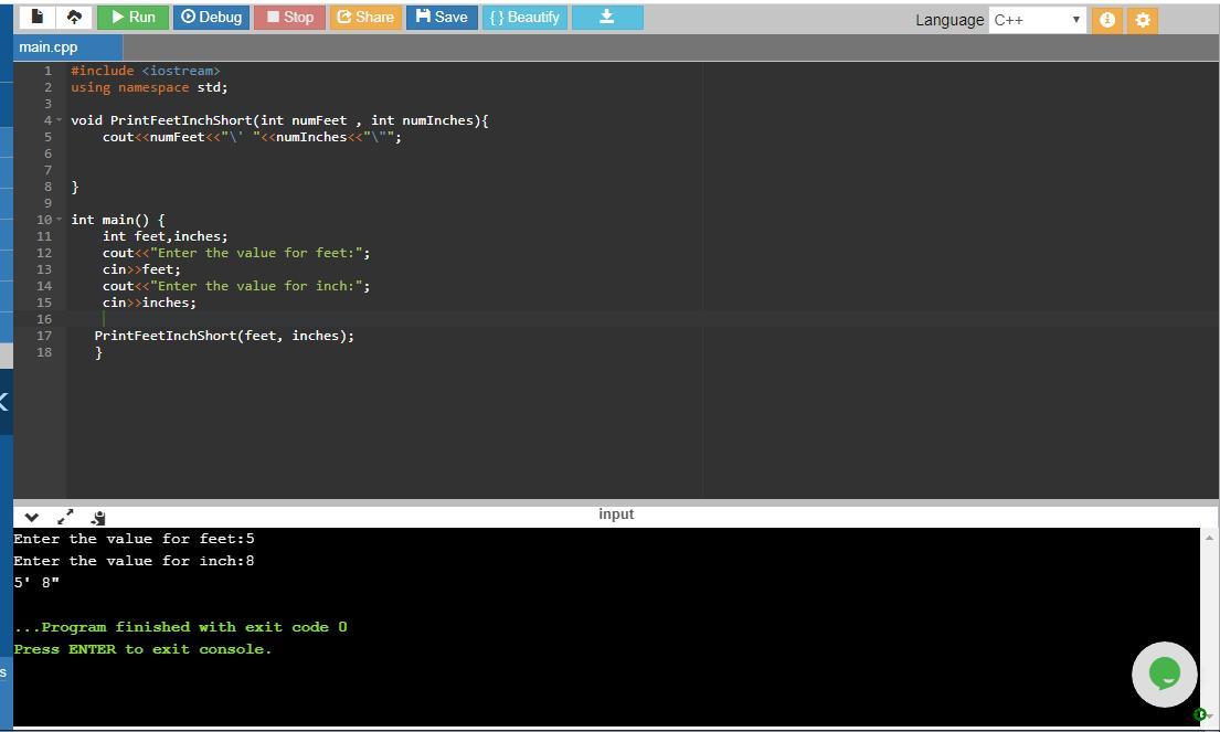 //calls PrintFeetInchShort() and passes values to the function i.e. 5 for //numFeet and 8 for numInches
