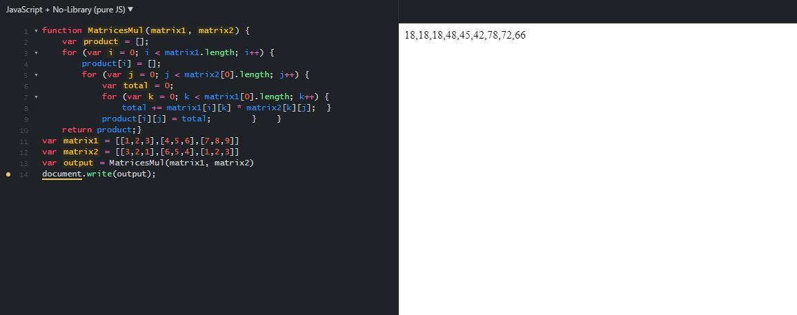 var output = MatricesMul() this calls the MatricesMul method and passes the two matrices (matrix1, matrix2) to the function and stores the result of this multiplication to output variable.