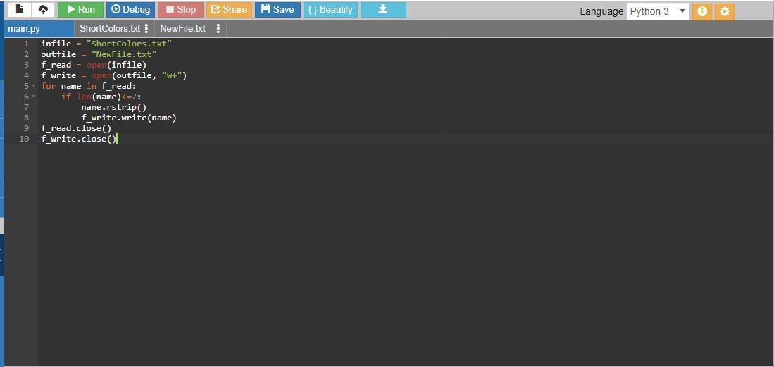 for name in f_read:  this is where the main work begins to remove the colors with more than six characters. The loop reads each name from the ShortColors.txt file and here f_read object is used in order use this text file. This loop continues to read each name in the text file and executes the statements within the body of this loop.