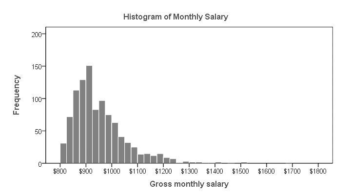 In the attached histogram example for this question, the histogram shows the monthly salaries of workers and the frequency of workers receiving whichever salary. The intervals for these salaries for this histograms are in steps of $25. The bars start from $800 to $825, $825 to $850 and so on.