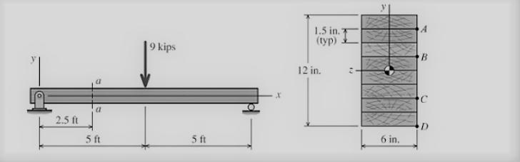 A 10-ft-long simply supported laminated wood beam consists of eight 1.5-in. by 6-in. planks glued together to form a section 6 i
