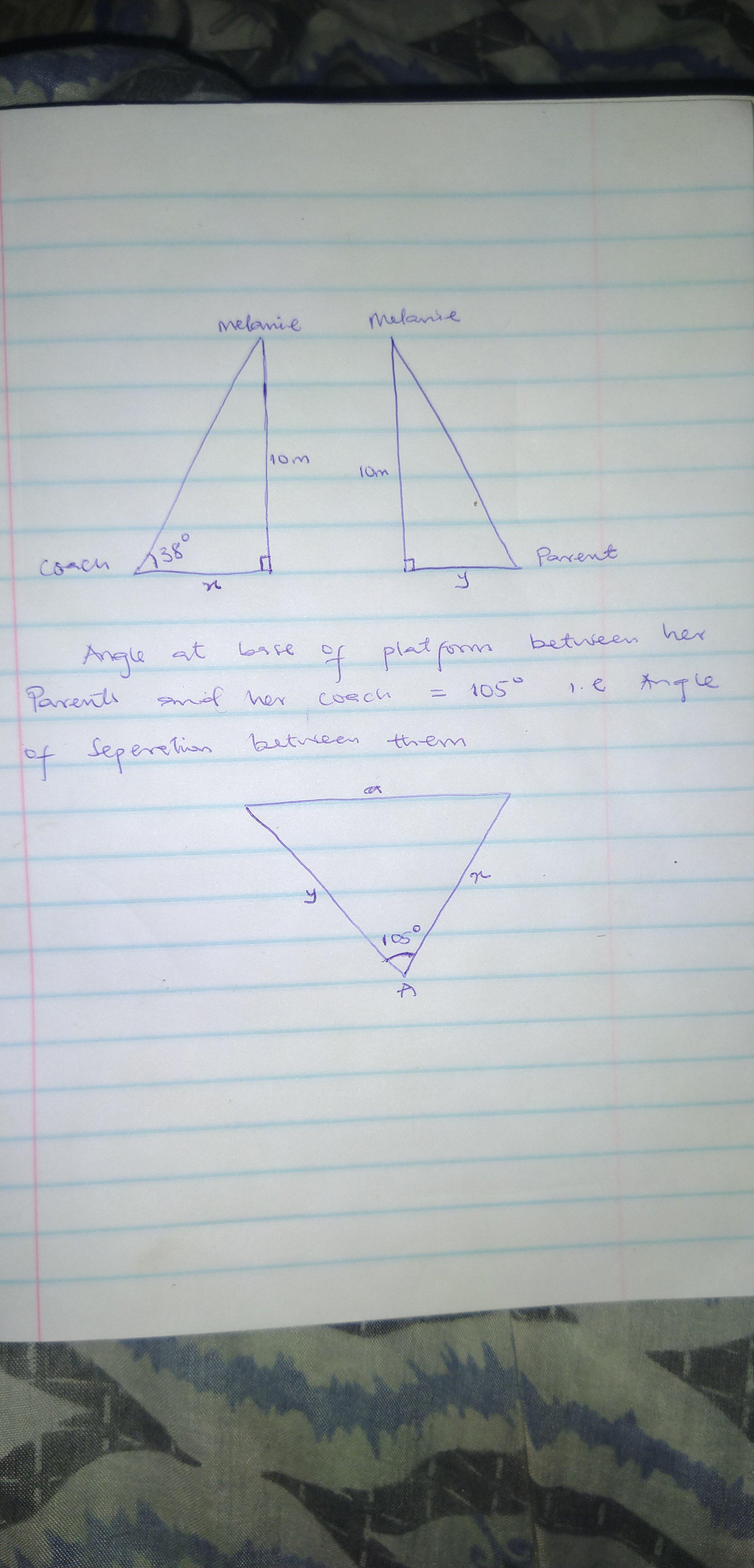 Angle at base of platform between Melanie's coach and her parent = 105°