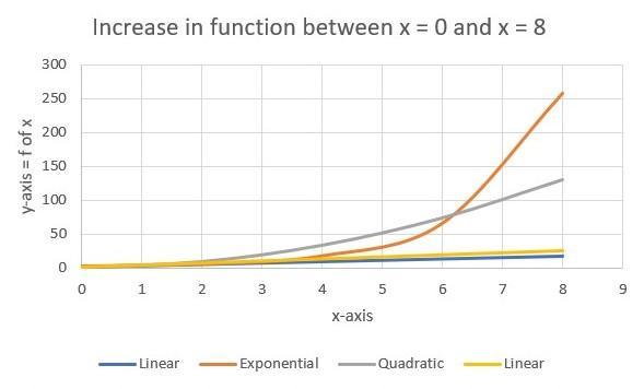 he equation f of x = 2 x + 2. The first column is labeled x with entries 0, 2, 4, 6, 8. The second column is labeled f of x with entries 2, 6, 10, 14, 18. A 2-column table with 5 rows titled Exponential Function with the equation f of x = 2 Superscript x Baseline + 2. The first column is labeled x with entries 0, 2, 4, 6, 8. The second column is labeled f of x with entries 3, 6, 18, 66, 258. A 2-column table with 5 rows titled Quadratic Function with the equation f of x = 2 x squared + 2. The first column is labeled x with entries 0, 2, 4, 6, 8. The second column is labeled f of x with entries 2, 10, 34, 74, 130. A 2-column table with 5 rows titled Linear Function with the equation f of x = 3 x + 2. The first column is labeled x with entries 0, 2, 4, 6, 8. The second column is labeled f of x with entries 2, 8, 14, 20, 26.
