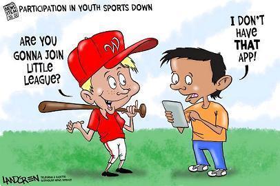 The cartoonists' perspective is about there being a decline in active participation in youth sports and the evidence that supports that there is an actual decline is that the boy at the right has no idea what the little league is and thinks it is an app.