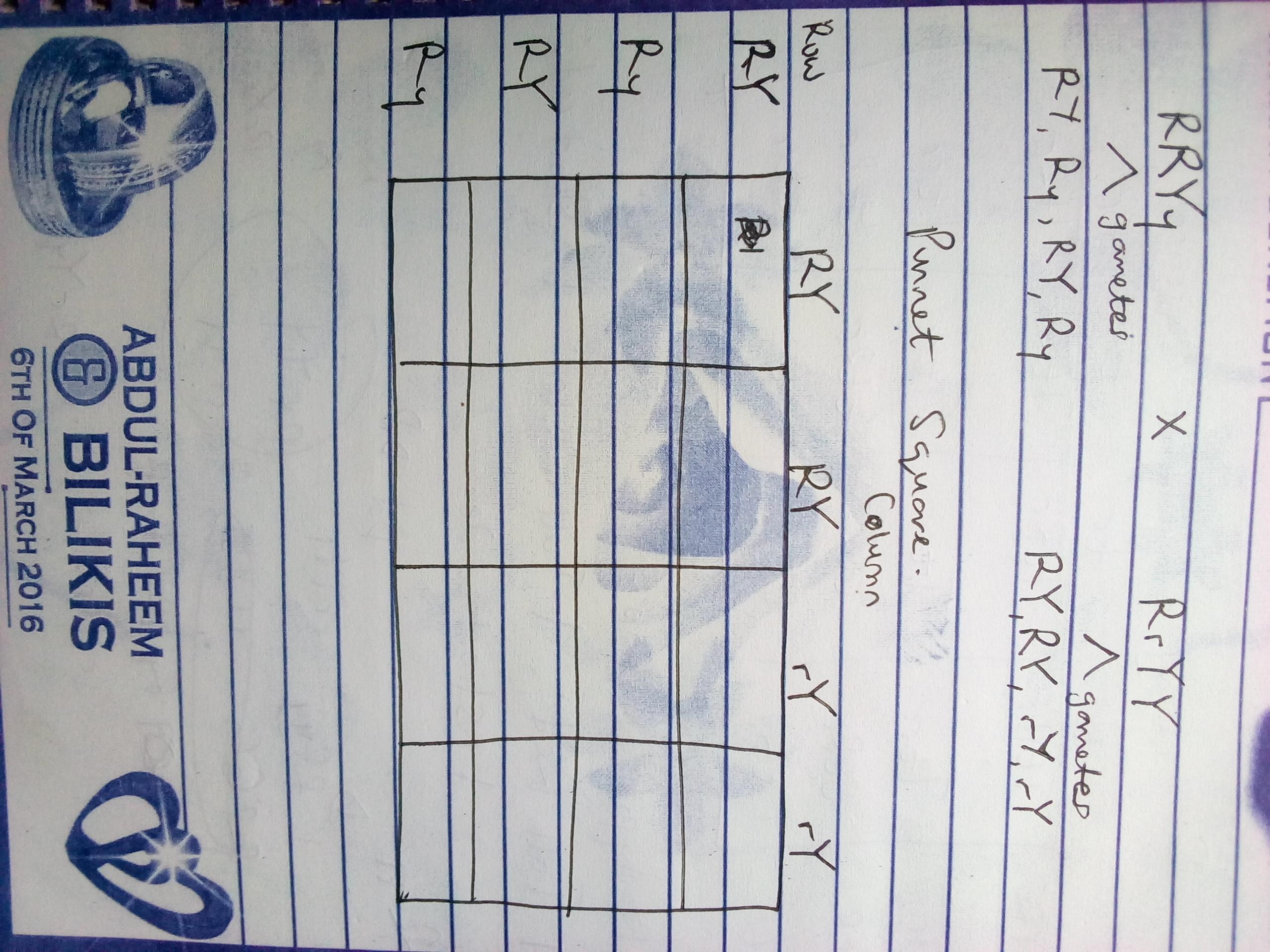 A punnet square, which is a square-shaped representation of a genetic cross is used. The four possible gametes of each parent are placed on the columns and rows of the punnet square. The gametes of parent RRYy i.e. RY, Ry, RY and Ry are labeled on the rows of the punnet square while the possible gametes of parent RrYY i.e. RY, RY, rY and rY are labeled on the columns of the punnet square. (See attached image)