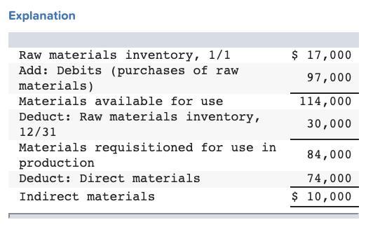 t year. Raw Materials Bal. 1/1 17,000 Credits ? Debits 97,000 Bal. 12/31 30,000 Work In Process Bal. 1/1 19,000 Credits 506,000 Direct materials 74,000 Direct labor 13,000 Overhead applied 257,000 Bal. 12/31 ? The cost of indirect materials requisitioned for use in production during the year was: