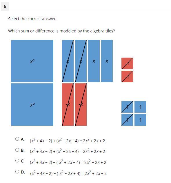 Which sum or difference is modeled by the algebra tiles?