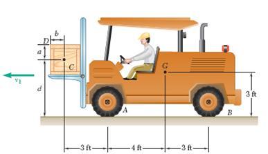 A uniform crate C with mass mC is being transported to the left by a forklift with a constant speed v1. What is the magnitude of